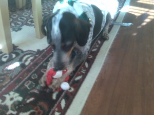 Mama T and I have been at war for Queen B status since I got here. Some days I let her win. After all, she controls my food and I love me some food. But most of the time I win, like in this picture. She tried to put that stupid Santa hat on my head and I was like, “Uhn uhn, my name is Prima Donna, not Bama Donna.” So I tore it off my head and ripped it up with my mouth. If she wants somebody to wear a damn Santa hat in this house, let her ‘cause I ain’t the one.
