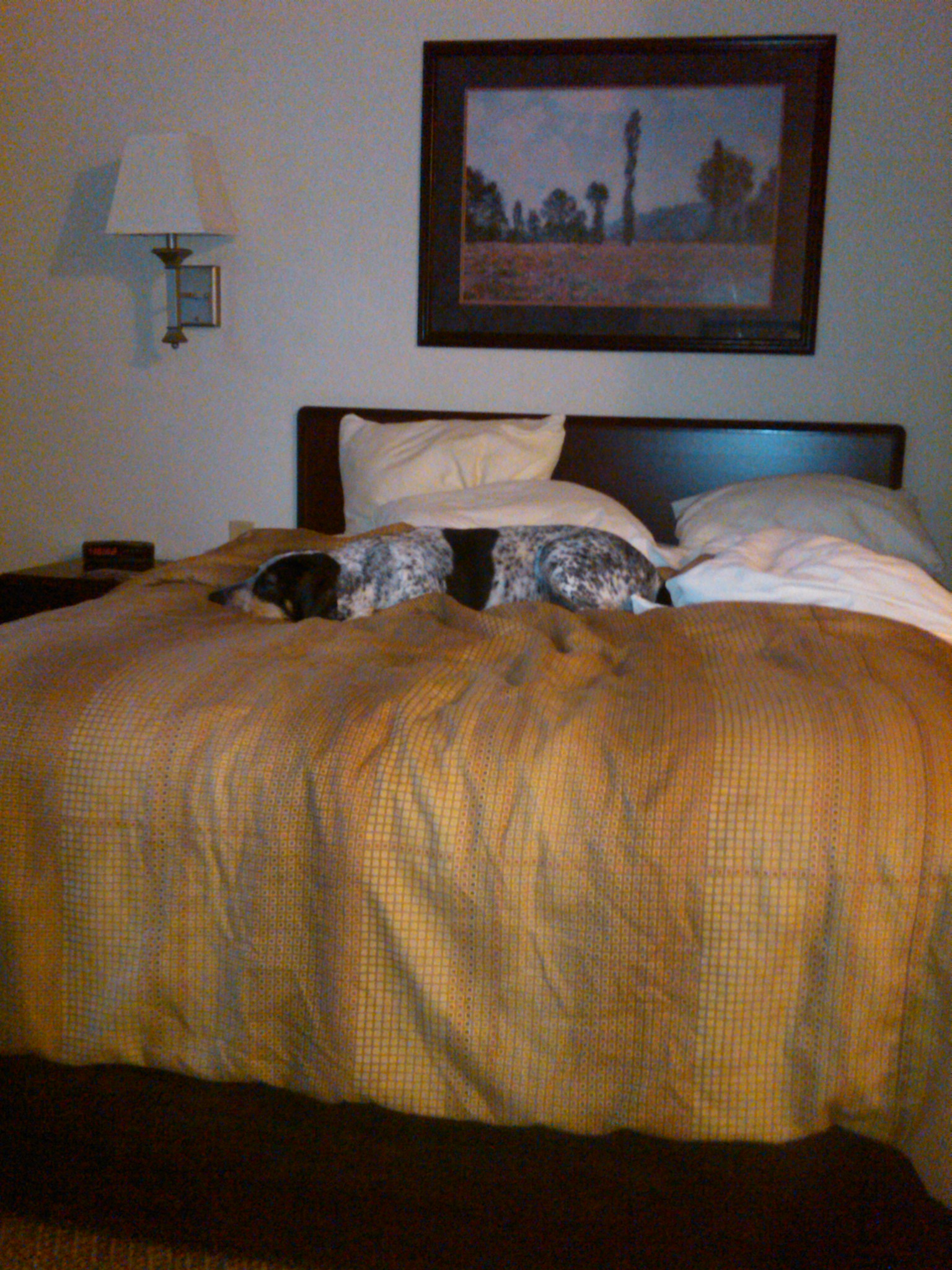 Then she tried to make me go outside in the rain to get in the car so we could come to the hotel. I ran from her cos it looked scary out there. Mama T refuses to chase me cos she read somewhere that coonhounds think that if you run, we’re supposed to chase you. Yep, we do. So she created this game and she’ll bend down and squint her eyes and look at me like she’s ‘bout to attack and say, “Gotcha!” And silly me I think it’s play time so I charge her and every freakin time she grabs my butt and strong arms me into a headlock and carries me where she wants me to go, this time to the car. Wuss I am, I don’t even try to fight it. What’s the use? Besides, she says I’m gettin too fat for her to keep carryin so Ima just bide my time.